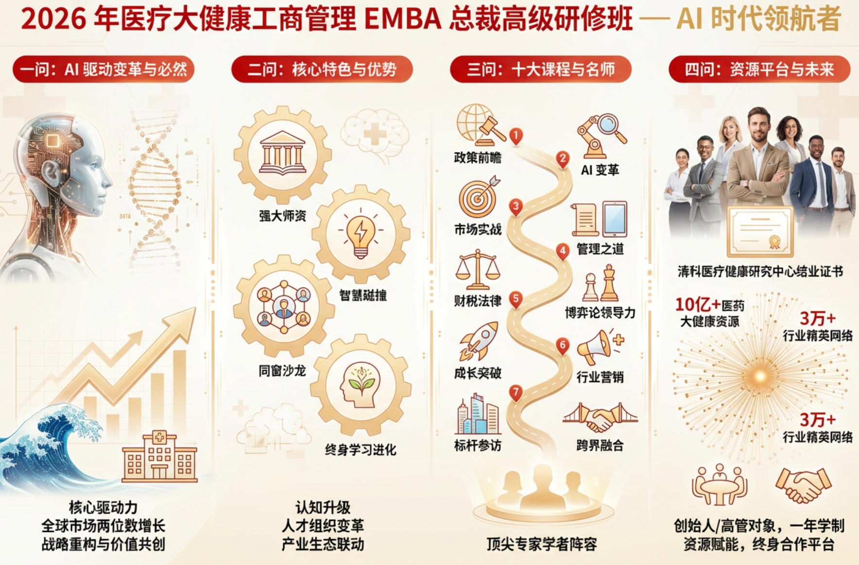 在当前数字化浪潮中,人工智能已成为推动医疗大健康行业变革与发展的核心驱动力。全球 AI 医疗市场规模正以每年两位数速度增长,预计未来将达到数千亿美元。企业必须紧跟时代趋势,借助优质资源和先进管理工具,才能在激烈竞争中立于不败之地。医疗大健康工商管理 EMBA 总裁高级研修项目正是在 AI 时代培养新时代精英的必然选择,旨在培养不仅是创新成长者,更是 AI 时代战略重构者和价值共创者的未来领导者。