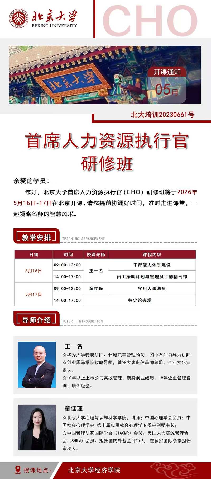 北京大学首席人力资源官(CHO)研修班2026年5月16日(周六)至5月17日(周日)在北京大学经济学院举办,为期两天,采用集中授课形式,学员可在北大校园内深度学习、交流研讨。