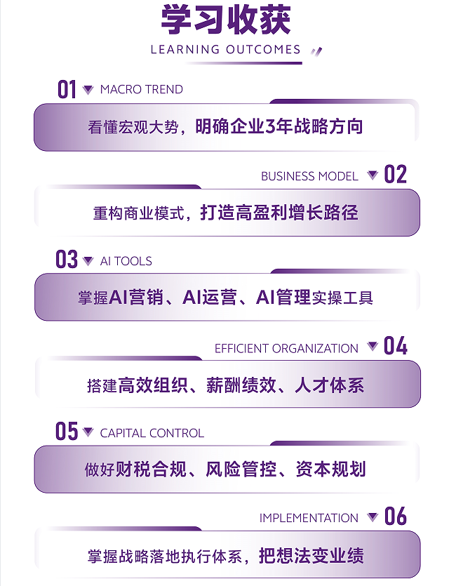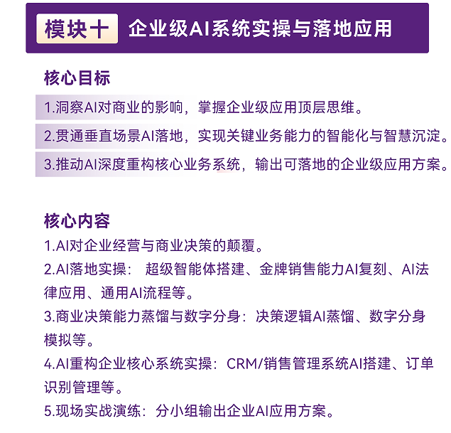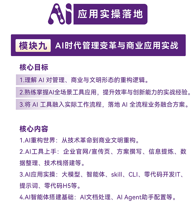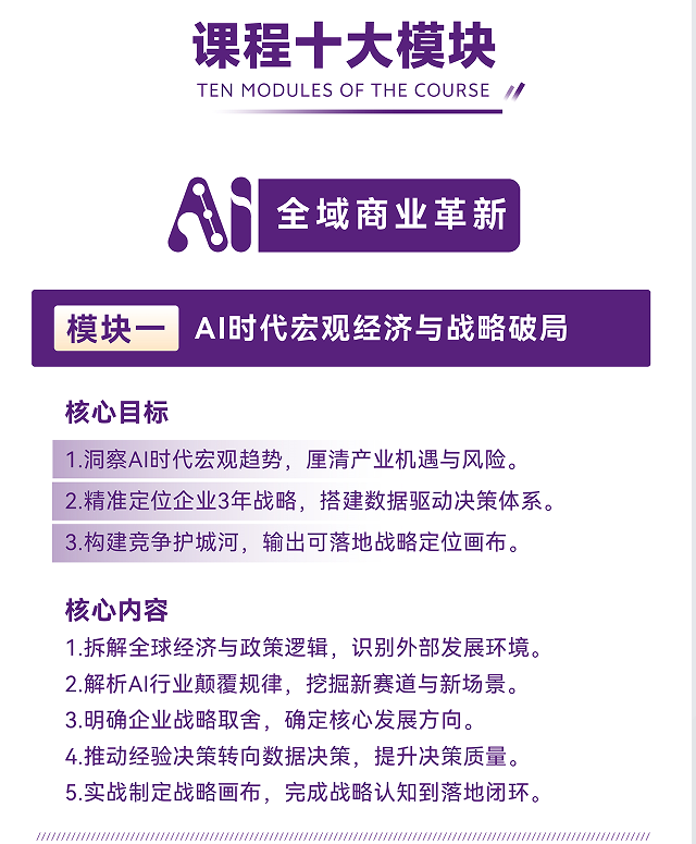 AI时代专为企业家打造的实战型EMBA工商管理高端研修课程,8大AI升级传统管理模块+2大AI核心实战模块,不讲空话、不玩概念,只教:能落地、能增效、能赚钱、能避险的经营方法。
