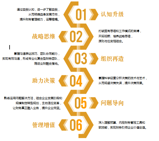 《中央财经大学CFO高级实战研修班》针对当今企业财务管理痛点,结合企业职业财务管理者的特点,凭借顶尖的研究教学师资、系统创新的课程,围绕政策、管理、决策、信息、应用、财务供应链、价值提升等内容,制订未来财务规划,从战术和战略两个路径辅助企业实现持续经营发展为目标,培养具备战略眼光、精通价值管理、驾驭资金周转、把握风险控制、通晓绩效评价、促进业财融合的卓越财务管理者。高效地组织企业的各项财务管理和会计工作,成功担当连接战略、流程和信息的纽带,提升各职能部门的有效沟通,使产业链、供销存等所有业务体系与财务系统的有机结合,实现企业价值最大化。